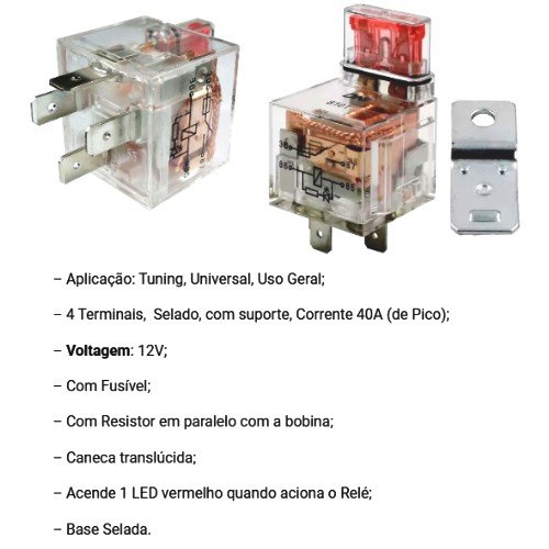 Rele Auxiliar Acrílico Com Led e Fusível 4 Pinos 40A 12V - DNI8101